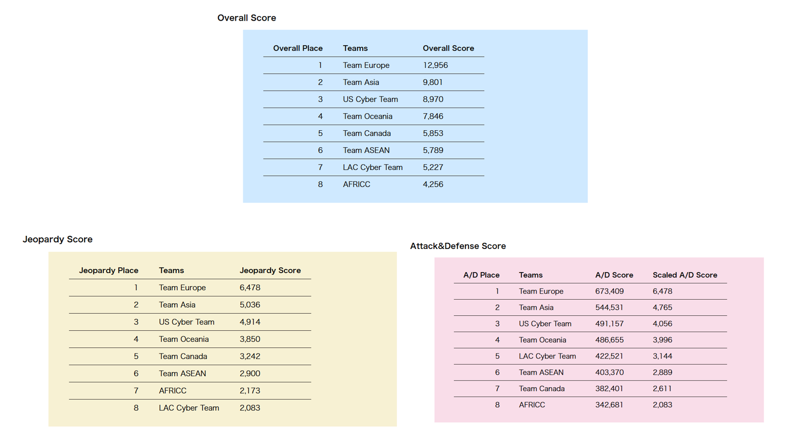 大会はクイズ形式で出題される問題を解いていくジョパディ形式と、リアルタイムの攻防戦であるアタックアンドディフェンス形式で実施され、それぞれ最終成績は以下のとおりとなりました。